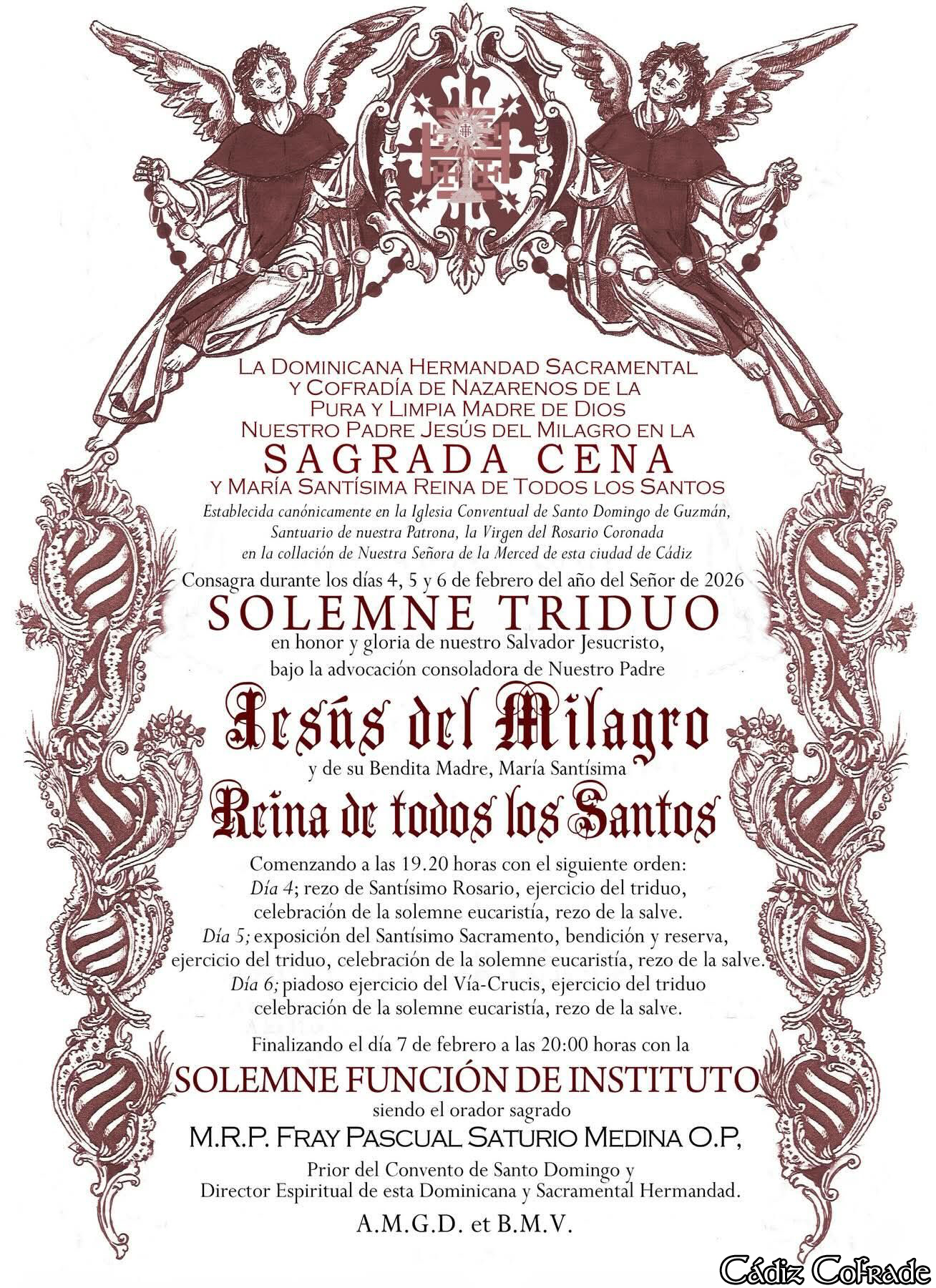 La Dominicana Hermandad Sacramental y Cofradía de Nazarenos de la Pura y Limpia Madre de Dios, Nuestro Padre Jesús del Milagro en la Sagrada Cena y María Santísima Reina de Todos los Santos celebrará (D. m.) el próximo 6 de febrero, viernes, Cabildo General Ordinario y Extraordinario.