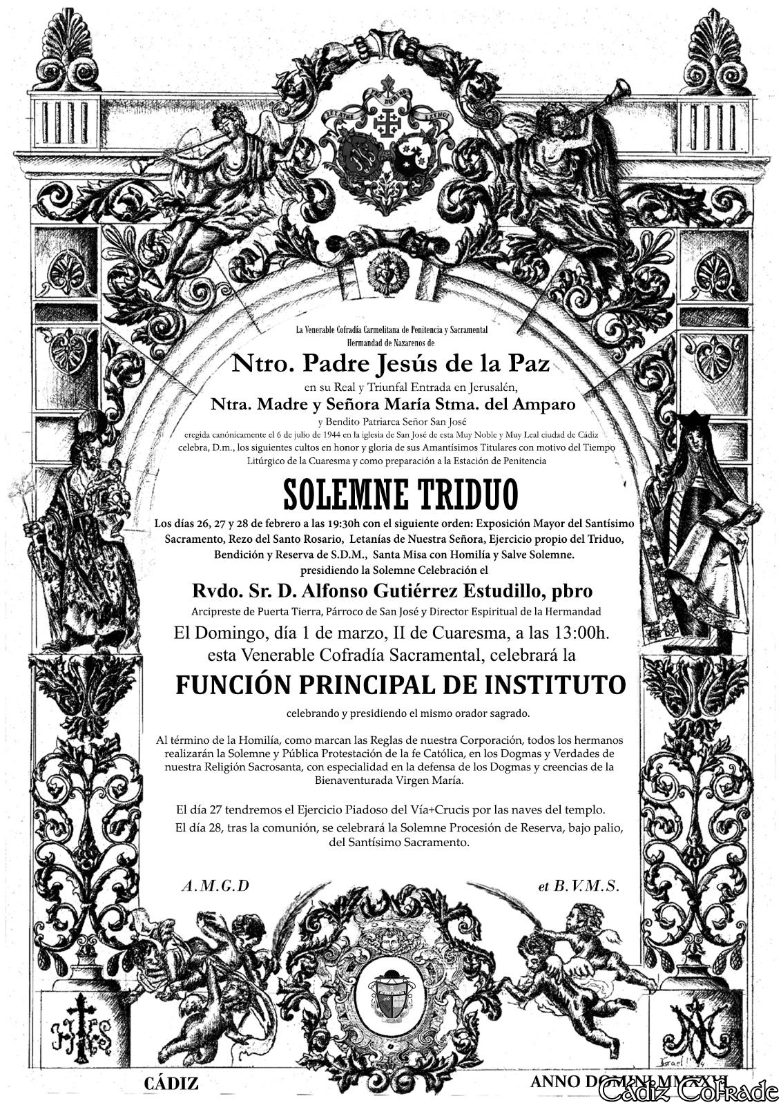 la corporación, al Cabildo General Ordinario y Extraordinario, que se celebrará, Dios mediante, el próximo viernes 27 de febrero, a las 21:00 horas en primera convocatoria y a las 21:15 horas en segunda, en la Iglesia del Beato Fray Diego José de Cádiz.