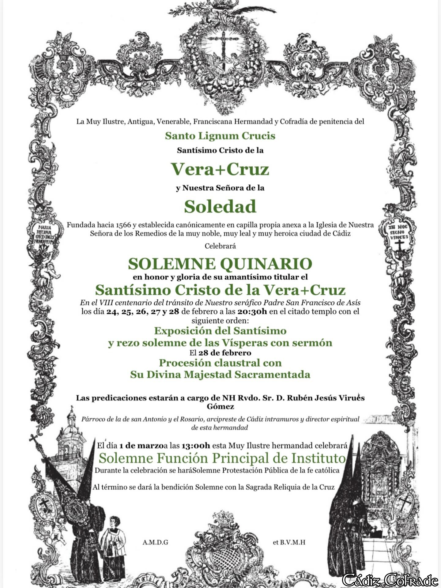 La Cofradía de la Vera+Cruz celebrará Solemne Quinario a su Titular en la Iglesia de San Francisco desde el 24 al 28 de febrero, los cultos serán predicados por el Rvdo. Sr. D. Rubén Virués Gómez,